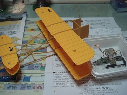 近くのハウンズに小物買いに行ったら夏休みコーナーこんな物が有りました。 ライト兄弟フライヤー号のグライダーです。 い以前から破損した機体から外したトイラジシステムで小型機を作りたかったので思わず買ってしまった。 昔もう一機トイラジを積んだ小型…